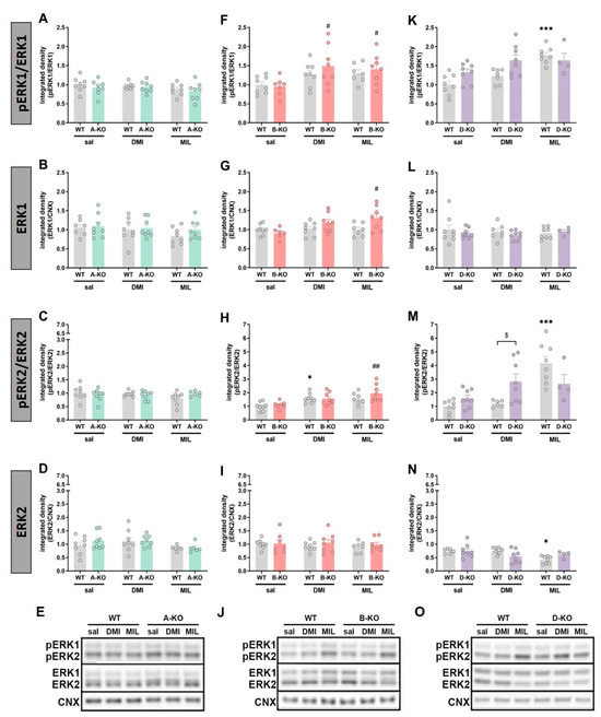 Phosphorylation and protein levels of ERK1 and ERK2 in the hippocampus of female wild-type (WT) mice and knockout mice with selective inactivation of α1A-adrenoceptor (A-KO) (graphs (A–E)), α1B-adrenoceptor (B-KO) (graphs (F–J)), and α1D-adrenoceptor (D-KO) (graphs (K–O)), and after chronic treatment with desipramine (DMI) or milnacipran (MIL). The mutual representative blot for CNX is visualized in panels (E,J,O) in both Figure 8 and Figure 9. Data are shown as mean values ± SEM with n = 4–8, analyzed using two-way analysis of variance (ANOVA) and Tukey’s post hoc test for unequal group sizes (Unequal N HSD). * p < 0.05 vs. WT sal, # p < 0.05 vs. KO sal, ## p < 0.01 vs. KO sal, ### p < 0.001 vs. KO sal, $$ p < 0.01 vs. WT drug, $$$ p < 0.001 vs. WT drug. Please refer to Figure 6 for the remaining descriptions.