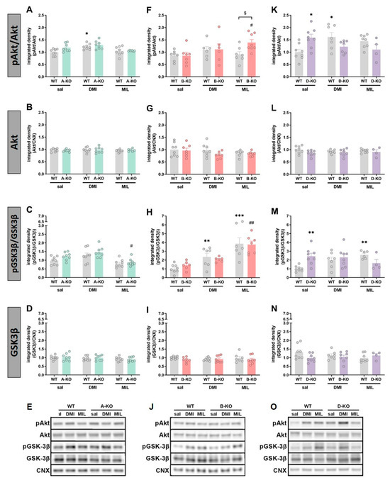Impact of repeatedly given antidepressant drugs, desipramine (DMI) or milnacipran (MIL), and the mutation effect on phosphorylation and protein levels of Akt and GSK3β in the hippocampus of male wild-type (WT) mice and knockout mice with selective inactivation of α1A-adrenoceptor (A-KO) (graphs (A–E)), α1B-adrenoceptor (B-KO) (graphs (F–J)), and α1D-adrenoceptor (D-KO) (graphs (K–O)), are presented. The mutual representative blot for CNX is visualized in panels (E,J,O), in both Figure 6 and Figure 7. Data are shown as mean values ± SEM with n = 4–8, analyzed using two-way analysis of variance (ANOVA) and Tukey’s post hoc test for unequal group sizes (Unequal N HSD).* p < 0.05 vs. WT sal, ** p < 0.01 vs. WT sal, *** p < 0.001 vs. WT sal, # p < 0.05 vs. KO sal, ## p < 0.01 vs. KO sal, $ p < 0.05 vs. WT drug. Please refer to Figure 6 for the remaining descriptions.