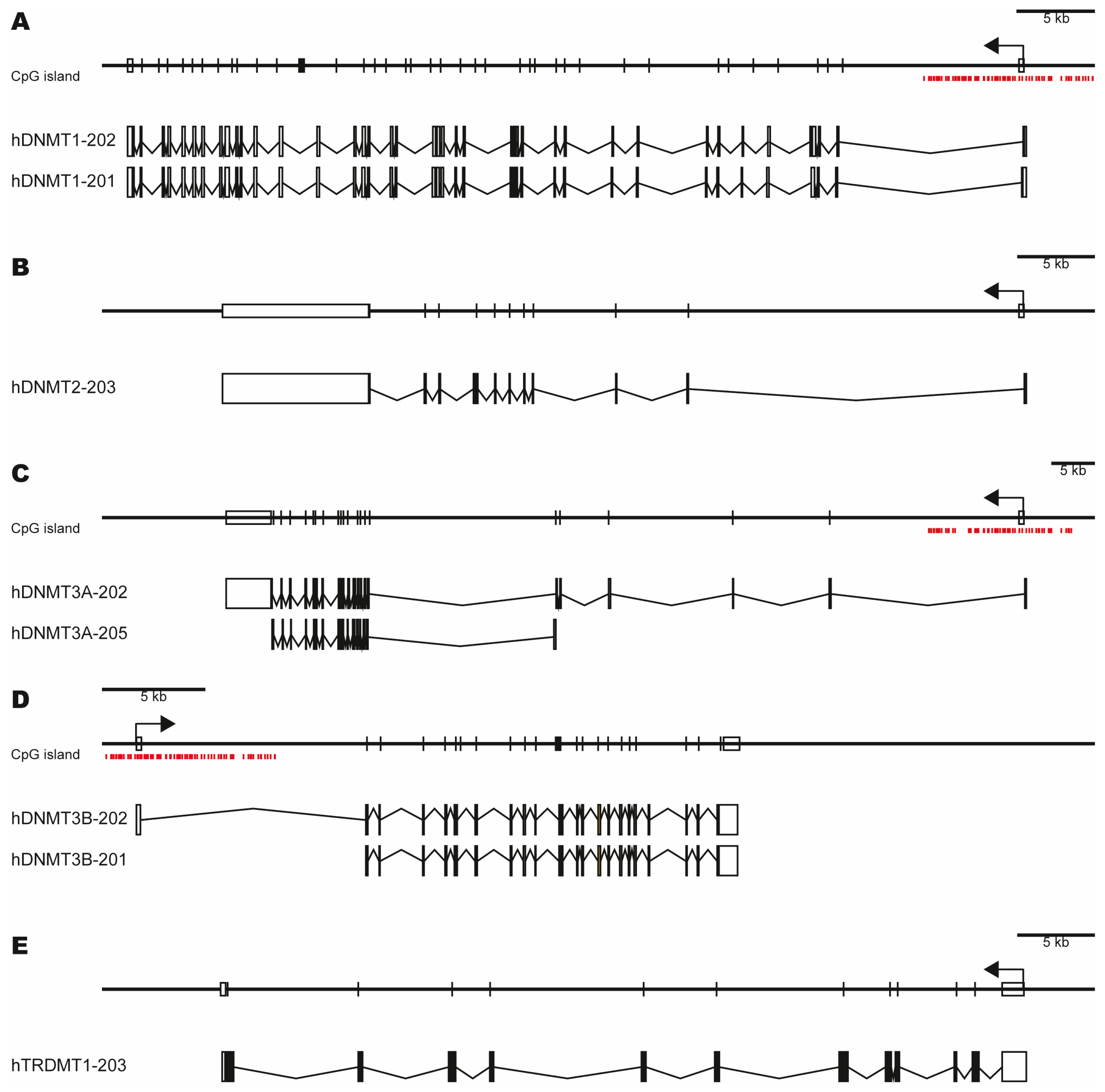 - Duymich, C.E.; Charlet, J.; Yang, X.; Jones, P.A.; Liang, G. DNMT3B isoforms without catalytic activity stimulate gene body methylation as accessory proteins in somatic cells. Nat. Commun. 2016, 7, 11453. [Google Scholar] [CrossRef]