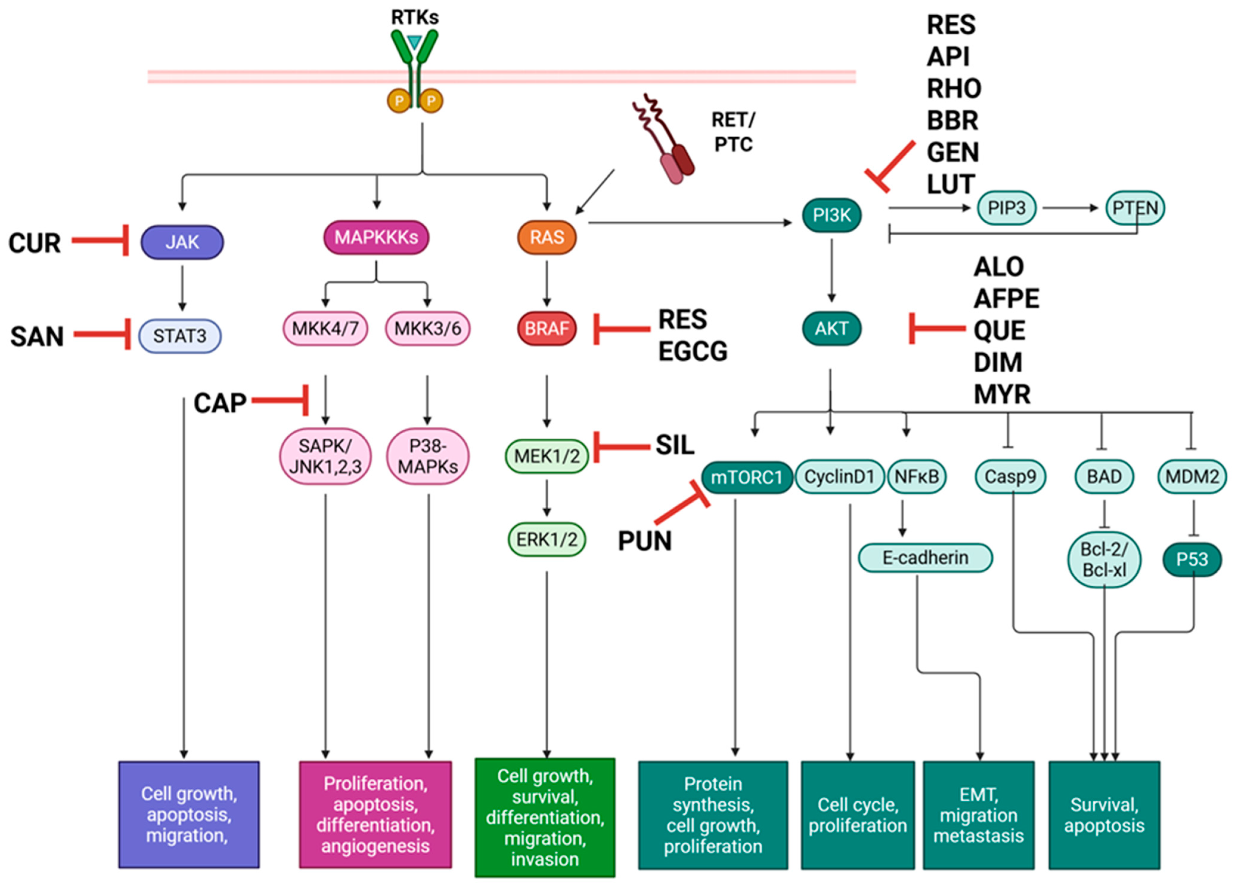 APA StyleCarnazza, M., Yang, N., Tiwari, R. K., Geliebter, J., & Li, X.-M. (2025). Natural Compounds Targeting MAPK, PI3K/Akt, and JAK/STAT Signaling in Papillary Thyroid Cancer. International Journal of Molecular Sciences, 26(21), 10498. https://doi.org/10.3390/ijms262110498