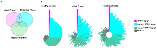 Transcriptomic profiling revealed common and distinct miRNAs among the study participants. (A) Venn diagram illustrates the number of miRNAs that were shared and unique between different study groups. (B) The normalized distribution patterns of 157 miRNAs in healthy and patient groups, either in the initial or finishing phase, are visualized as circo plots. On the Circo plots, pink, blue, green, and gray correspond to miRNAs with high (RPM > log104), medium (log104 < RPM > log102), low (log102 < RPM > log101), and RPM > 0 read per million values, respectively. In every case, the order of the miRNAs (the representative bars) was the same. Bar lengths refer to the log10 RPM sequence number.