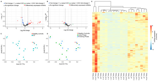 Altered miRNAs expression patterns between the study cohorts. A volcano plot was generated to identify the miRNAs showing fold differences between the rectal cancer patients and healthy volunteers (A) as well as between the initial and the finishing phases (B) with statistical significance (p values ≤ 0.05) and expressing log2-fold changes greater than 1 and lower than −1 using the LIMMA statistical model. Each dot represents a single miRNA. The dashed line on the y-axis indicates the p-value = 0.05 threshold with statistically significant (p < 0.05) gene expression (up- and downregulation, respectively). Red circles indicate differentially expressed miRNas with statistically significant overexpression and underexpression. We calculated the statistical differences between healthy volunteers and adenocarcinoma cancer patients using the Mann–Whitney test. Ordination pattern analyses representing the differences in distribution patterns between colon cancer (CC) (blue) and healthy volunteers (red) (C). The differences between healthy control (red), initial phase (green), and finishing phase (blue) (D) were also assessed. Cluster heatmap of 154 miRNAs with RPM ≥ 10 (E).