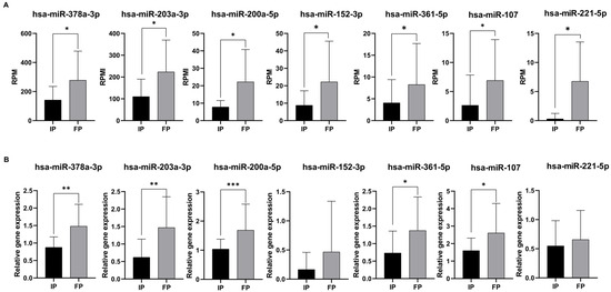 Validation of differentially expressed miRNAs by RT-qPCR. Data shows small RNA sequencing results (A). Data shows RPM (read per million vales). Normalized relative gene expressions (normalized to hsa-let-7i-5p) of miRNAs were calculated with the Livac formula (B). As an internal control, has-miR-let7-5p was used. The amount of the transcripts was normalized to those of the housekeeping gene (has-miR-let7-5p) using the ΔCT method. Finally, the results were further normalized to the expression of the control (healthy volunteers) (ΔΔCT method). Healthy volunteers’ (control) relative gene expressions were 1 in every case and are not shown in the figure. Statistical comparison between the initial phase and finishing phase was performed with the Mann–Whitney test. Data is shown as mean ± SD. Asterisks report statistical significance * p < 0.05; ** p < 0.005; and *** p < 0.001. IP: initial phase, FP: finishing phase, and RPM: read per million.