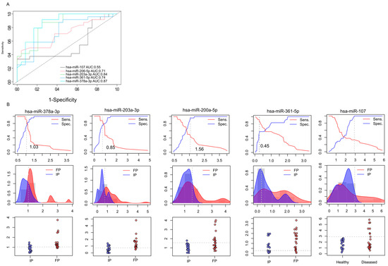 In addition, the relative gene expression values of patients (IP and FP) were also dichotomized by plotting the sensitivity values in relation to 1-specificity to estimate the optimal cutoff values for these biomarkers (Figure 4B). This approach was used to determine the optimal cutoff values for these biomarkers. We observed that the hsa-miR-378a-3p displayed 1.03, hsa-miR-203a-3p showed 0.85, hsa-miR-200a-5p had 1.56, hsa-miR-361-5p displayed 0.45, and hsa-miR-107 showed 2.98 cutoff values.