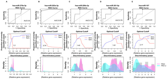 Accuracy for predicting tumor regression grade based on the relative gene expression of significantly altered miRNAs. ROC (receiver operating characteristics) analyses were assessed based on miRNAs expressions determined by RT-qPCR. The following miRNAs’ discriminatory powers were determined for this analysis: hsa-miR-378a-3p (A), hsa-miR-203a-3p (B), hsa-miR-200a-5p (C), hsa-miR-361-5p (D), and hsa-miR-107p (E). Data shows the differences in miRNAs expressions between the TRG1 and TRG2 groups compared to the TRG3 tumor regression patients’ group. Line graphs were used to calculate the optimal cutoff points. Discriminatory power graphs represent the distribution of the relative gene expression values in TRG1 with TRG2 and TRG3. TRG: tumor regression grade.