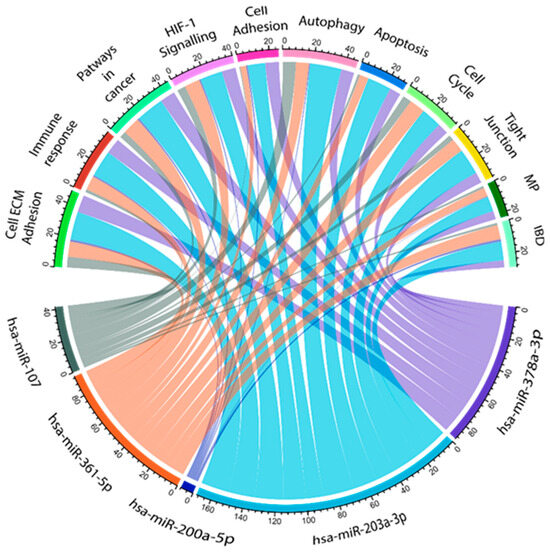 Interaction network of CR-related significantly dysregulated miRNAs. Information assessed from the KEGG and miRabel databases revealed 11 possible biological pathways that can be related to the investigated miRNAs. ECM: extracellular matrix, MP: metabolic pathways, and IBD: inflammatory bowel disease. Cord plot was generated in R studio (ver 401) with circlize pipeline.