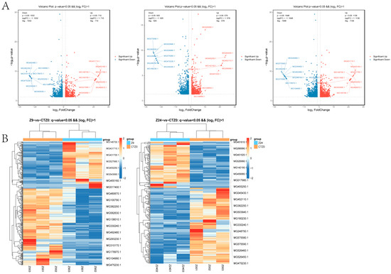 Differentially expressed genes among transcribed groups in foot tissue of mussel. (A). Volcano Plot of DEGs between 9 h vs. 0 h control, 24 h vs. 0 h control, and 9 h, 24 h vs. 0 h control. The dots in the graph represent transcripts that are significantly differentially expressed. Blue dots represent transcripts with significantly lower expression levels, while red circles represent transcripts with significantly higher expression levels (p < 0.05). &&: Both screening criteria were met in the figure (p-value < 0.05 and |log2FC| > 1.0). (B). Cluster heat map of differential gene expression among transcribed groups in foot tissue of mussel. &&: Both screening criteria were met in the figure (q-value < 0.05 and |log2FC| > 1.0).