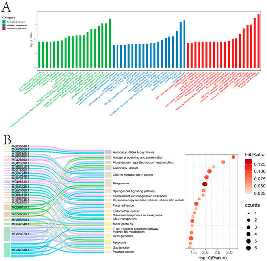 The 1138 up-regulated DEGs were annotated to 1333 GO subcategories (Figure 2A). GO enrichment analysis indicated that they were enriched in categories such as cytoplasm, nucleus, membrane, metal ion binding, extracellular space, plasma membrane, mitochondrion, ATP binding, extracellular region, mitochondrion, and identical protein binding, etc. KEGG analysis revealed that the 1138 up-regulated genes were distributed in 244 pathways (Figure 2B). The enriched pathways potentially associated with byssus secretion mainly included phagosome, autophagy—animal, focal adhesion, apoptosis, PI3K-Akt signaling pathway, antigen processing and presentation, axon guidance, and regulation of actin cytoskeleton, etc.