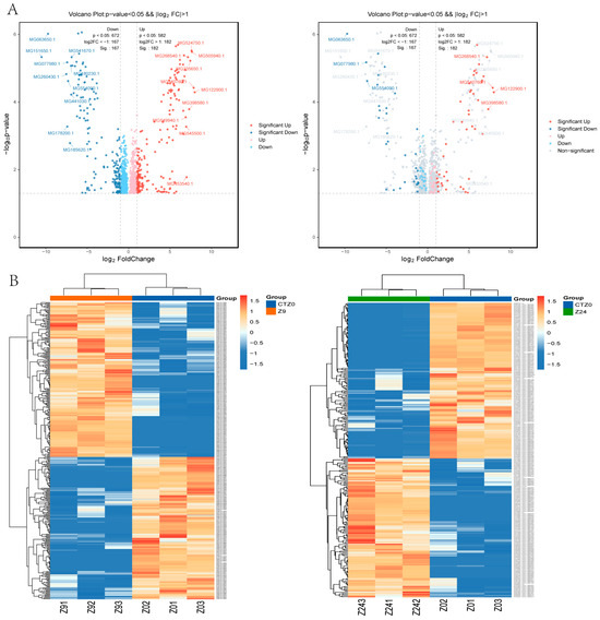 DEPs (differentially expressed proteins) in foot tissue of mussel. &&: Both screening criteria were met in the figure (p-value < 0.05 and |log2FC| > 1.0). (A). Volcano Plot of DEPs between 9 h vs. 0 h control, 24 h vs. 0 h control. The dots in the graph represent proteins that are significantly differentially expressed. Blue dots represent proteins with significantly lower expression levels, while red circles represent proteins with significantly higher expression levels (p < 0.05). (B). Cluster heat map of differential protein expression between groups of mussel foot tissue protein.
