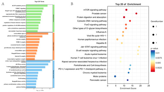 The 709 up-regulated DEGs were annotated to 430 GO subcategories (Figure 4A). They were enriched in categories such as extracellular space, membrane, cytoplasm, plasma membrane, zinc ion binding, ATP binding, serine-type endopeptidase inhibitor activity, extracellular region, metal ion binding, GTP binding, and DNA binding, etc. KEGG analysis revealed that the 709 proteins were distributed in 243 pathways (Figure 4B). The enriched pathways included protein digestion and absorption, motor proteins, mTOR signaling, other types of O-glycan biosynthesis, cytosolic DNA sensing, cytoskeleton in muscle cells, etc.
