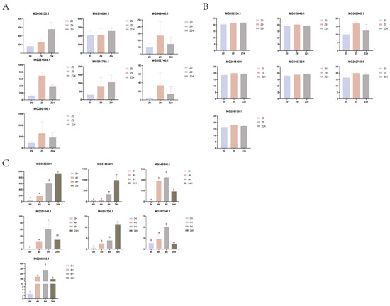 Expression patterns of seven selected genes. (A). The expression profiles based on transcriptomic data; (B). The expression profiles based on proteomic data; (C). qPCR analysis. a, b, c: Different letters indicate that the p-value between groups is <0.05.