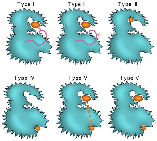 The binding mode of different TKI generations. Type I TKIs compete for the ATP binding site of the kinase enzyme and binds to the “DFG-in” active conformation of the enzyme (the pink ribbon represents the Asp-Phe-Gly motif and the Y-shape represents the aspartate amino acid residue of the DFG motif). In Type II TKIs, the inhibitor binds to the ATP binding site of the enzyme in the “DFG-out” inactive conformation (aspartate residue faces outward of the binding site of the enzyme). Type III and type IV TKIs bind to different allosteric sites on the enzyme. Type V and type VI inhibitors are bivalent molecules that bind to both the ATP binding pocket and the distant allosteric site with type VI inhibitors forming irreversible covalent bonds at both sites. The inhibitor molecule is represented by either a small or large brown hexagon.