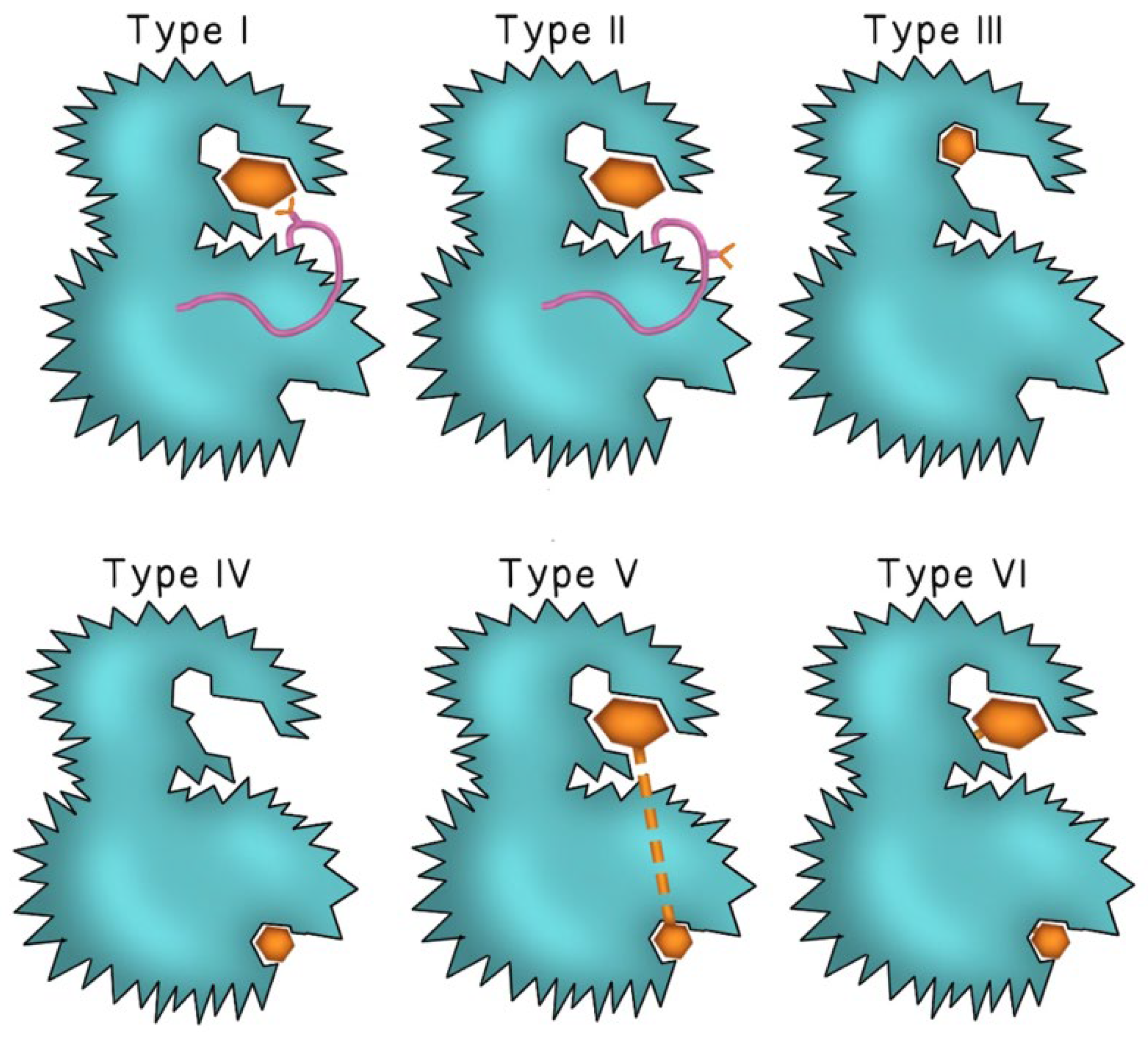 Figure 1. The binding mode of different TKI generations. Type I TKIs compete for the ATP binding site of the kinase enzyme and binds to the “DFG-in” active conformation of the enzyme (the pink ribbon represents the Asp-Phe-Gly motif and the Y-shape represents the aspartate amino acid residue of the DFG motif). In Type II TKIs, the inhibitor binds to the ATP binding site of the enzyme in the “DFG-out” inactive conformation (aspartate residue faces outward of the binding site of the enzyme). Type III and type IV TKIs bind to different allosteric sites on the enzyme. Type V and type VI inhibitors are bivalent molecules that bind to both the ATP binding pocket and the distant allosteric site with type VI inhibitors forming irreversible covalent bonds at both sites. The inhibitor molecule is represented by either a small or large brown hexagon.