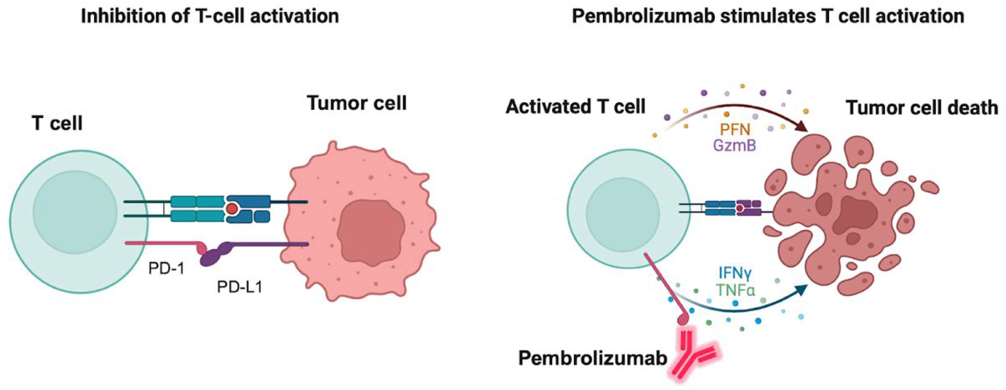 Figure 2. Mechanism of action of pembrolizumab. The left panel shows the binding of the immune checkpoint-programmed death receptor 1 (PD-1) to its endogenous ligand PD-L1 with consequent inhibition of T-cell activation and prevention of tumor cells attack. The right panel shows the binding of pembrolizumab to PD-1 with consequent activation of T-cells and release of the apoptosis mediators granzyme B (GzmB), perforin (PFN), tumor necrosis factor (TNF) alpha and interferon (IFN) gamma with consequent tumor cell apoptosis. Created in BioRender. Fandy, T. (2025) https://BioRender.com/y8s65re (accessed on 27 October 2025).
