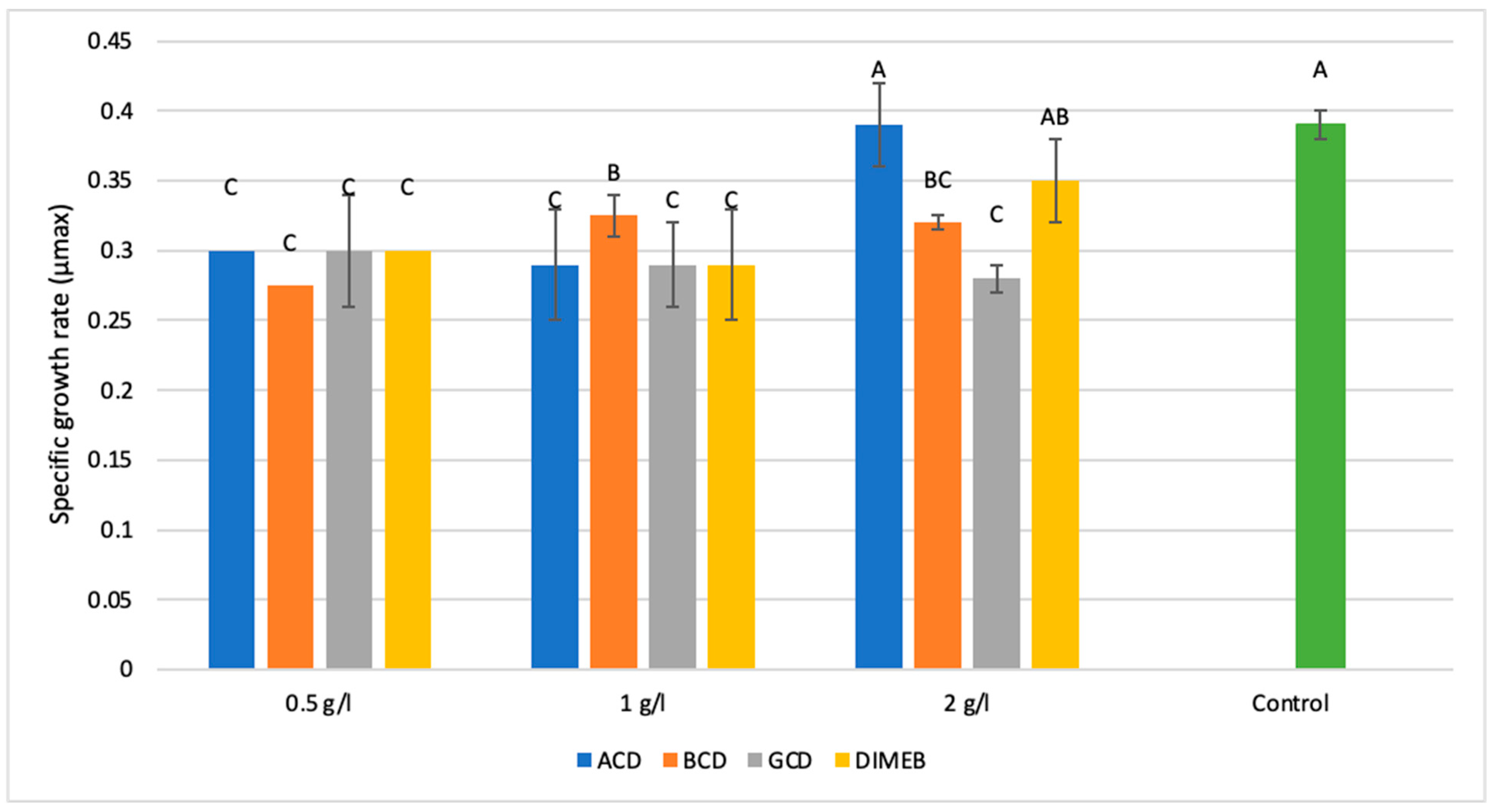 2.1.1. Impact of Cyclodextrin Derivatives on Maximum Specific Growth Rate (Umax)