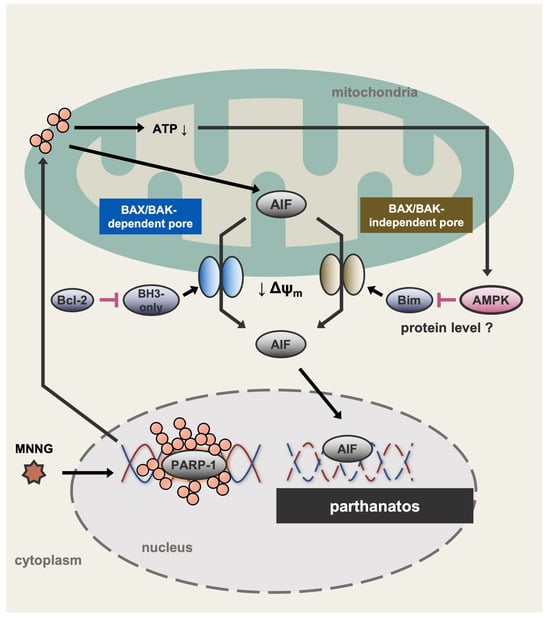 Hamano, S.; Maruyama, T.; Suzuki, M.; Mitsuya, M.; Yokosawa, T.; Hirata, Y.; Matsuzawa, A.; Noguchi, T. AMPK Limits MNNG-Induced Parthanatos by Inhibiting BH3-Only Protein Bim. Int. J. Mol. Sci. 2025, 26, 10519. https://doi.org/10.3390/ijms262110519
