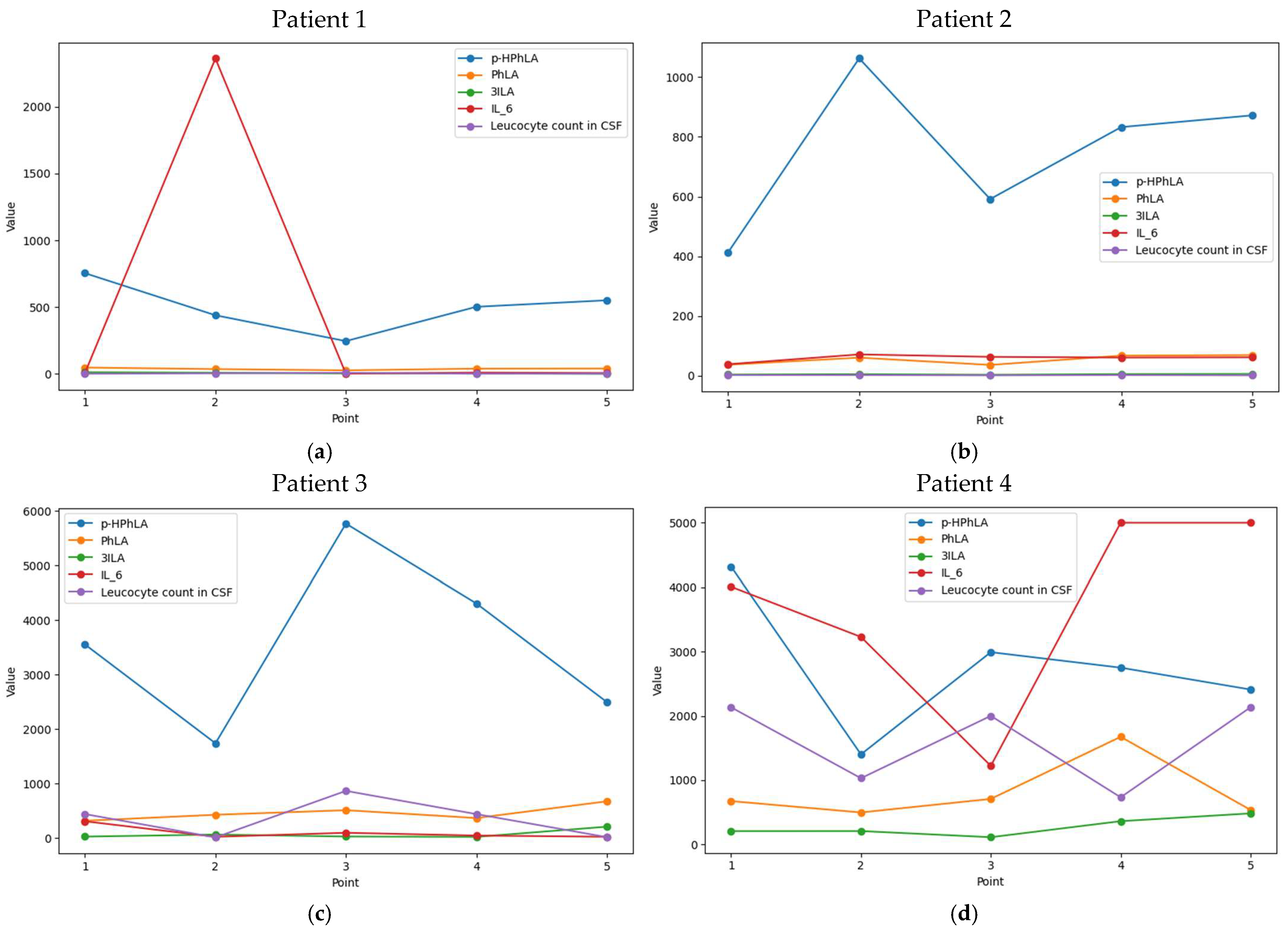 - Pautova, A.K.; Meglei, A.Y.; Chernevskaya, E.A.; Alexandrova, I.A.; Beloborodova, N.V. 4-Hydroxyphenyllactic Acid in Cerebrospinal Fluid as a Possible Marker of Post-Neurosurgical Meningitis: Retrospective Study. J. Pers. Med. 2022, 12, 399. [Google Scholar] [CrossRef]