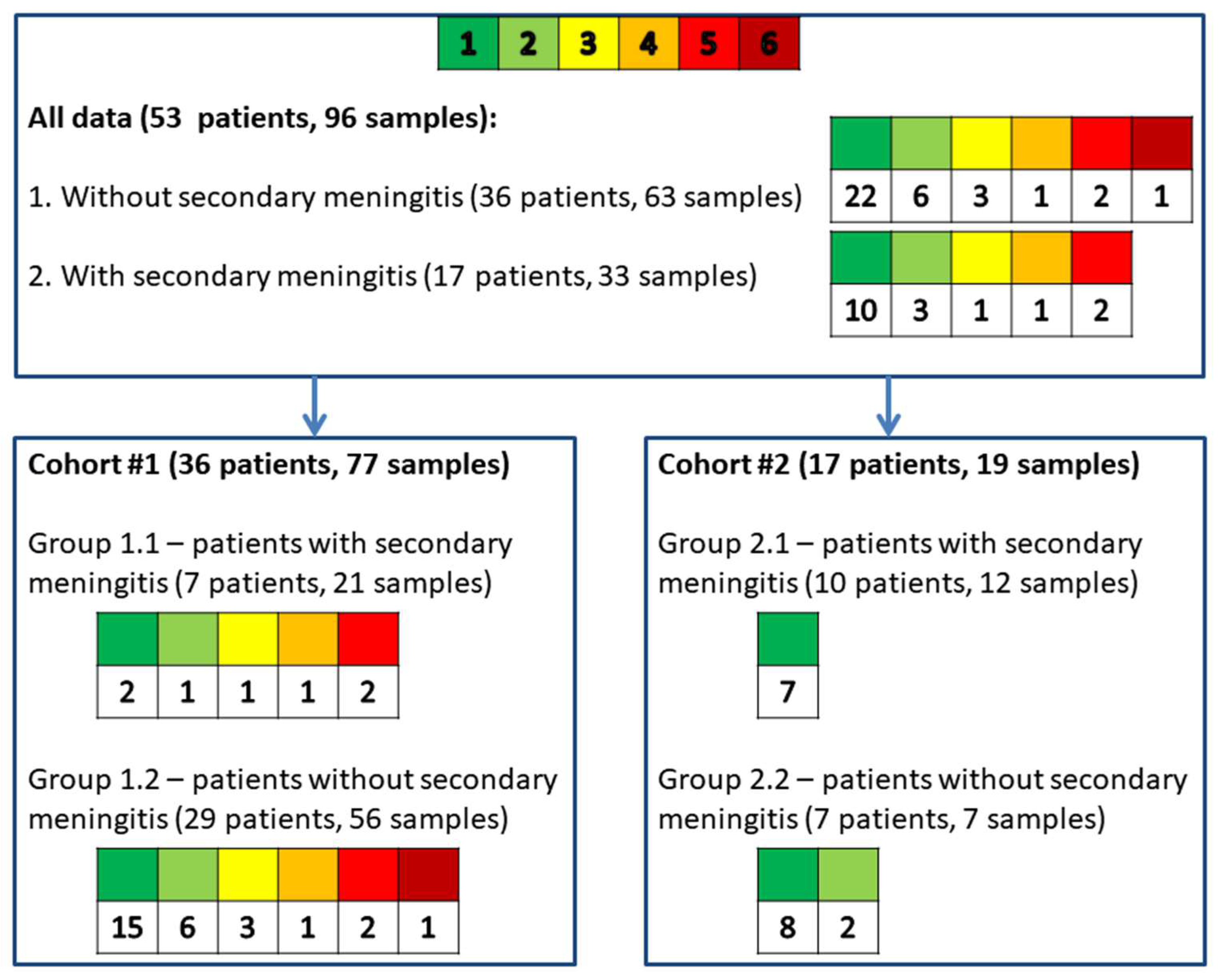 | All Patients/Samples | Group 1.1 with Secondary Meningitis | Group 1.2 Without Secondary Meningitis | All Patients/Samples | Group 2.1 with Secondary Meningitis | Group 2.2 Without Secondary Meningitis | |