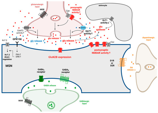The synaptic changes at MSN in NAc during repeated and chronic opioid use and withdrawal. MSNs make synapses with DArgic neurons from the VTA. They also receive glutamatergic inputs from several brain regions, including the PFC, BLA, ventral Hipp, the paraventricular nuclei of the thalamus, and the VTA. GABAergic inputs reach the MSNs from local inhibitory interneurons and from the projecting VP neurons (for more details, see Figure 1). Several of these glutamatergic and GABAergic inputs are under the presynaptic control of MORs. MORs are expressed in VgluT2+ glutamatergic neurons, and these MORs are essential in the development of naloxone-precipitated withdrawal symptoms. During repeated opioid administration, the activity of presynaptic and postsynaptic NMDAR, as well as their coupling with calcium channels, increases in the MSNs. The concentration of extracellular glutamate could increase, especially during opioid withdrawal. The reason behind this could be that the activity of GLT1 is decreased in astrocytes during OUD, and glutamate release is increased in OUD as well. In the NAc, GluN2B-containing NMDARs play a crucial role in the development of OUD. The elevated glutamate level increases the release of glycine via glycine heterotransporters located on the glutamatergic axon terminals. Glycine is capable of modulating GPR158, which is expressed on MSNs. As a recent finding, GPR158 is a metabotropic glycine receptor that activates PKA-ERK signalling in the presence of glycine. As a result of the activation of the GPR158/PKA/ERK pathway, the expression of Kv7.2 is downregulated. The downregulation of the Kv7.2 potassium channel and the increased activity of NMDARs contribute to the hyperexcitability of MSNs, which is observed during repeated opioid administration and withdrawal. During withdrawal, DA release decreases from VTA DArgic neurons due to the increased activity of GABAergic neurons projecting to the VTA DArgic neurons. In the NAc, the GABA release is increased in acute withdrawal. In accordance with this, it was shown that the excitability of MSNs decreased during acute opioid withdrawal, and hyperexcitability of MSNs could be detected during long-term opioid withdrawal. ↑: increase; ↓: decrease. Adopted from [45,108,120,130,140,141,143,161,205,208,209,210,211,212,213,214,215,216,217,218,219]. Created in BioRender. Gergely, T. (2025) https://BioRender.com/u2oekl0.