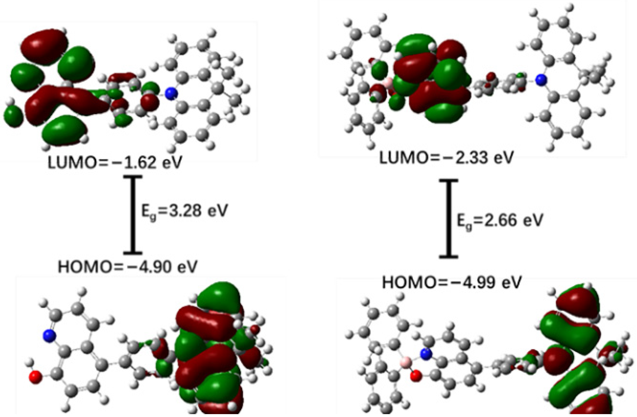 - Rao, Y.L.; Wang, S. Four-coordinate organoboron compounds with a π-conjugated chelate ligand for optoelectronic applications. Inorg. Chem. 2011, 50, 12263–12274. [Google Scholar] [CrossRef] [PubMed]