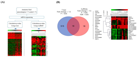 Workflow and identification of differentially expressed genes (DEGs) in preeclampsia. (A) Flow chart summarizing the two analysis pipelines applied to 14 amniotic fluid supernatant samples from preeclampsia and control groups, accompanied by a heatmap illustrating the DEGs identified by each analysis method. (B) Overlap analysis and heatmap of DEGs identified by both t-test and Cufflinks methods.