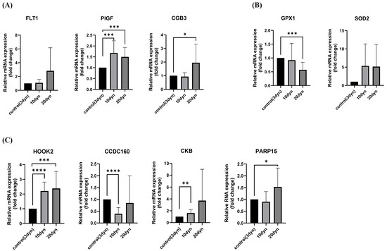 Considering the central role of oxidative stress in the pathophysiology of PE, we investigated oxidative stress markers after exposure to fluid shear stress, as illustrated in Figure 2B. Consistent with previous reports, the expression of GPX1 decreased following fluid shear stress, whereas SOD2 expression increased. Subsequently, we selected candidate genes based on the differential expression analysis from RNA sequencing results, as depicted in Figure 2C. We chose HOOK2, CCDC160, CKB, and PARP15, which emerged as DEGs from the RNA sequencing data. These genes were further examined for mRNA expression differences using RT-PCR in HTR-8/SVneo cells exposed to shear stress conditions of 3, 10, and 20 dyn/cm2 for 24 h. HOOK2 mRNA levels were found to increase significantly with escalating shear stress, showing marked elevation from the control group to 10 and 20 dyn/cm2, respectively. This pattern of HOOK2 upregulation was in accordance with the RNA sequencing findings. Notably, exposure to higher shear stress intensities resulted in statistically significant increases in HOOK2 expression (10 dyn/cm2: p < 0.0001; 20 dyn/cm2: p < 0.001).