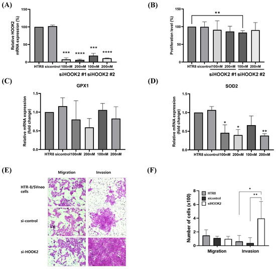 Functional analysis of HOOK2 knockdown in trophoblasts. (A) HOOK2 expression in HTR-8/SVneo cells following siRNA-mediated knockdown compared with si-control (B) Cell proliferation in HTR-8/SVneo cells following HOOK2 knockdown. (C,D) Expression of oxidative stress markers GPX1 (C) and SOD2 (D) after HOOK2 knockdown. (E,F) Effect of HOOK2 knockdown on trophoblast motility: representative microscopic images (E) and quantitative analysis of migration and invasion (F) (* p < 0.05, ** p < 0.01, *** p < 0.001, **** p < 0.0001).