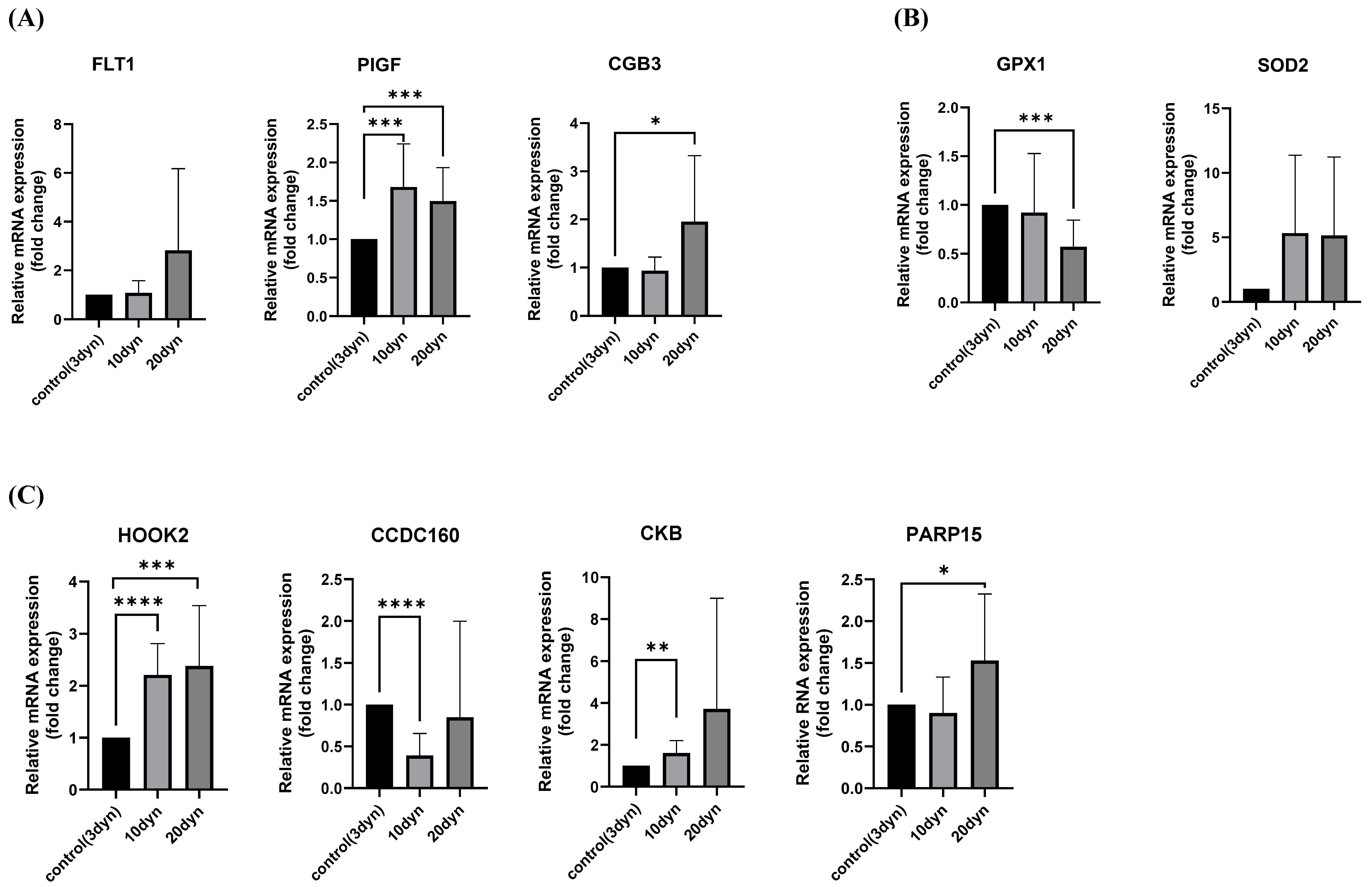 Figure 2. Validation of preeclampsia (PE)-associated gene expression in trophoblasts exposed to fluid shear stress. (A) Expression of established PE markers (FLT-1, PlGF, CGB3) in HTR-8/SVneo cells under increasing shear stress. (B) Expression of oxidative stress markers (GPX1, SOD2) in response to shear stress. (C) Expression of candidate DEGs (HOOK2, CCDC160, CKB, PARP15) in HTR-8/SVneo cells exposed to shear stress (* p < 0.05, ** p < 0.01, *** p < 0.001, **** p < 0.0001).