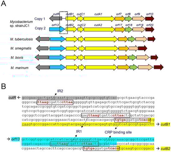 Genomic sequence analysis of Mycobacterium sp. strain JC1 reveals two copies of the CO-DH gene, resulting from a gene cluster duplication. Both cutB genes (cutB1 and cutB2) contain the CutR target sequence IR1 in their upstream regions. CO-DH expression is subject to catabolic repression, as indicated by the presence of a CRP binding site near the promoter regions of both cutB genes, adjacent to IR1. Additionally, IR2 is located upstream of cutB1, likely due to the proximity of the cutR gene. Functional analyses indicate that while both cutB1 and cutB2 promoters are active, cutB2 is more strongly activated by CutR, suggesting that IR1 alone is sufficient for CutR-mediated activation of the cutB genes.