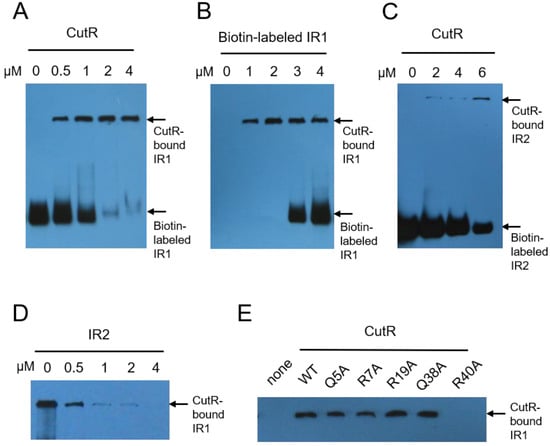 CO-DH was expressed in Mycobacterium sp. strain JC1 in the absence of CO, provided that CutR was present. Therefore, the DNA-binding capability of the dimeric form of CutR was evaluated using an electrophoretic mobility shift assay (EMSA) without CO. IR1, located near the −35 region upstream of the cutB gene, was selected for analysis. Reporter gene assays demonstrated that the activity of the cutB promoter depended on CutR, and deletion of IR1 abolished reporter expression even in the presence of CutR []. In EMSA, dimeric CutR bound to a DNA fragment containing IR1, as evidenced by a gel shift in biotin-labeled fragments in the presence of CutR (Figure 3A,B).