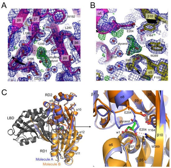 Within LTTRs, the ligand-binding site is typically located in the cleft between RD1 and RD2, extending into the interior of RD2. The CutR crystal structure revealed small ligands at these positions. Ethylene glycol, used as a crystallization additive, was observed sandwiched between the C-terminal ends of β7 and β8 in RD2, stabilizing the β-sheet (Figure 5A). Additionally, a glycerol molecule, used as a cryoprotectant, was detected in the cleft between the RD1 and RD2 subdomains of one monomer (molecule B) (Figure 5B). Molecule B appears more favorable for glycerol interaction due to crystal packing. To identify structural alterations, the structure of molecule B was superimposed onto that of molecule A (Figure 5C). The glycerol molecule occupies the position of the E204 side chain in molecule A. The glycerol forms hydrogen bonds with S97, G99, and W269, whereas the carboxyl group of E204 in molecule A forms hydrogen bonds with the side chains of S97 and W269, as well as with the main chain amide group of G99 via a water molecule. Due to the presence of glycerol, the carboxyl group of E204 in molecule B shifts toward the β-sheet of RD2 and interacts with the hydroxyl group of Y164, which is hydrogen-bonded to a water molecule in molecule A. This glycerol-induced rearrangement alters the local conformation of the loop containing E204 and causes subsequent movement of the α6 and α8 helices.