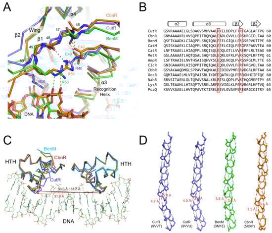 The DBD of CutR comprises a canonical wHTH motif and a dimerization helix. The DNA-binding motif is formed by the α2 and α3 helices, followed by a β-hairpin that contributes to interactions with the DNA backbone. The R40 residue, located on the α3 recognition helix, is critical for DNA binding, as demonstrated by the loss of binding in the R40A mutant. Structural analysis reveals that R40 interacts with the main chain carbonyl oxygens of P46 and F48, stabilizing the orientation of the wing relative to the recognition helix and supporting productive interactions with DNA phosphates (Figure 6A). At the equivalent position to R40, a glutamic acid residue is conserved in most LTTRs (Figure 6B). In the crystal structures of BenM [] and CbnR [], E40 stabilizes the position of the wing through an interaction with the amide group of residues N47 (Figure 6A). Due to the difference in charge of R40 in CutR, the peptide backbone at P46 is flipped compared to that in BenM and CbnR.