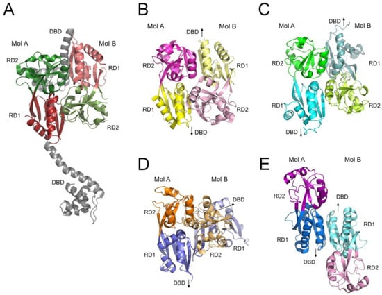 It is well established that LTTRs bind DNA as dimers through their α4 dimerization helices, and that two dimeric LTTRs can associate via their LBDs to form tetrameric LTTR complexes. Structural studies of tetrameric LTTRs have revealed asymmetric arrangements of their LBDs within homodimeric DBD units, alongside a two-fold symmetric arrangement of LBDs from different DBD pairs as shown in the crystal structure of CbnR [] (Figure 7A). However, to date, no dimeric structure featuring a symmetric LBD arrangement together with a two-fold symmetric DBD dimer has been reported. Symmetric dimeric arrangements of LBDs have been observed in crystal structures of isolated LBDs, such as those of CynR [] and Cbl []. In these dimers, the β-sheets from RD1 and RD2 are connected in a parallel manner (Figure 7B,C). The close contact between RD1 and RD2 subdomains resembles the arrangement of RD subdomains in the DBD pairs of tetrameric LTTRs. This configuration, however, cannot support the characteristic antiparallel interactions of the dimeric DBD, which are necessary for the correct positioning of the two dimerization helices.