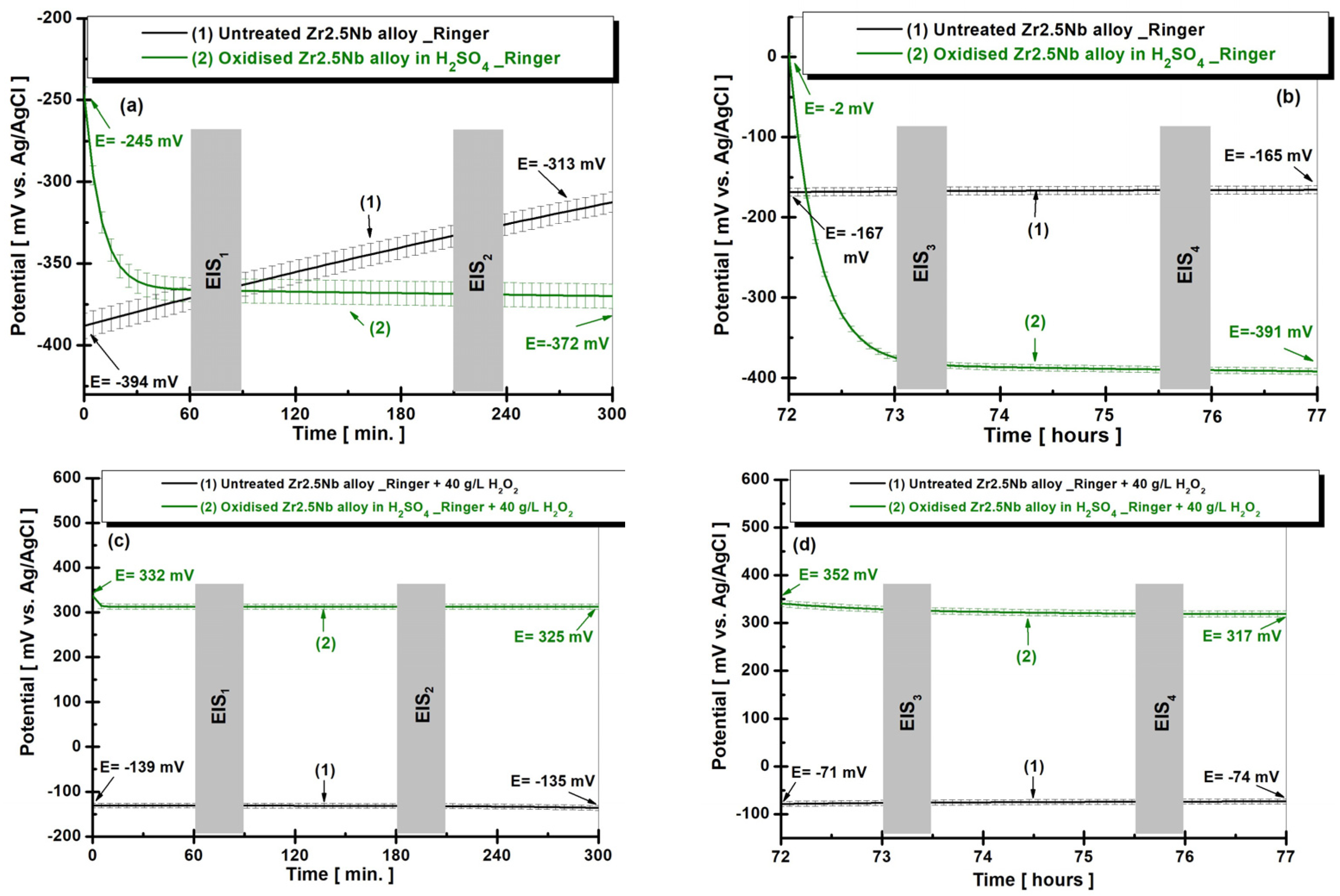 2.3.1. Evolution of the Open Circuit Potential (OCP) for Untreated and Electrochemically Modified Zr2.5Nb Alloy After Immersion in Physiological and Pathological Environments