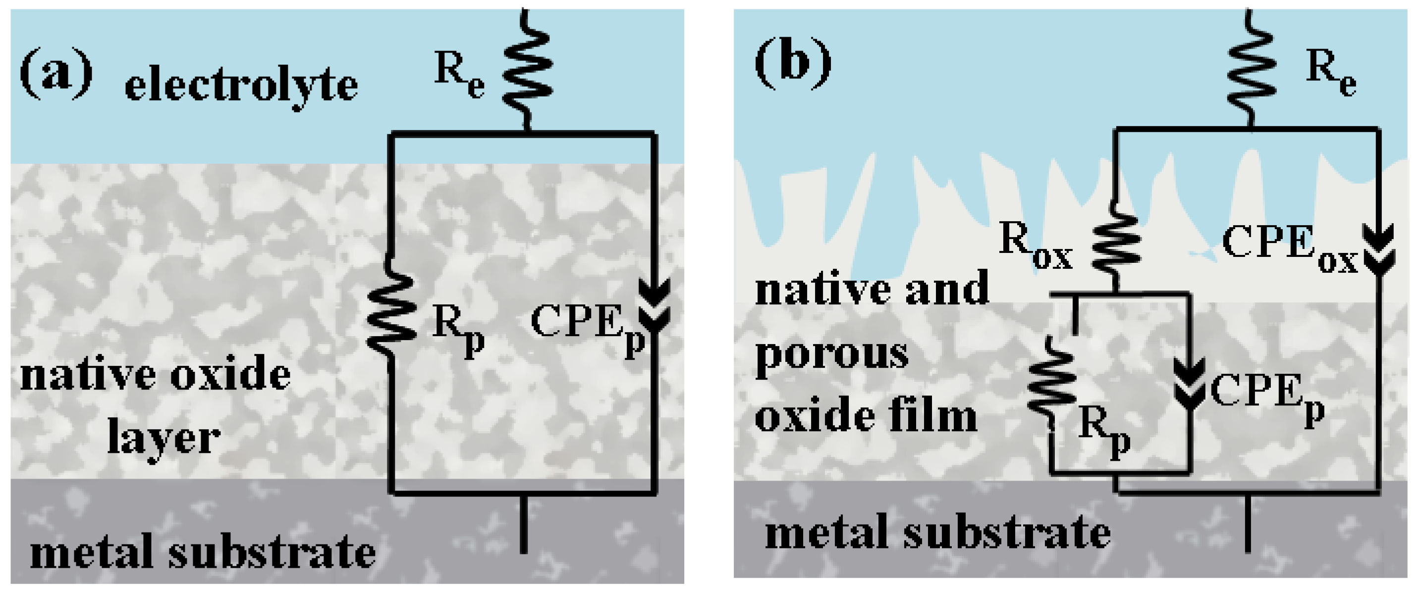 | CPE-P [F/cm2] | 7.466 × 10−6 / 6.451 × 10−6 | 6.189 × 10−8 / 7.984 × 10−8 |