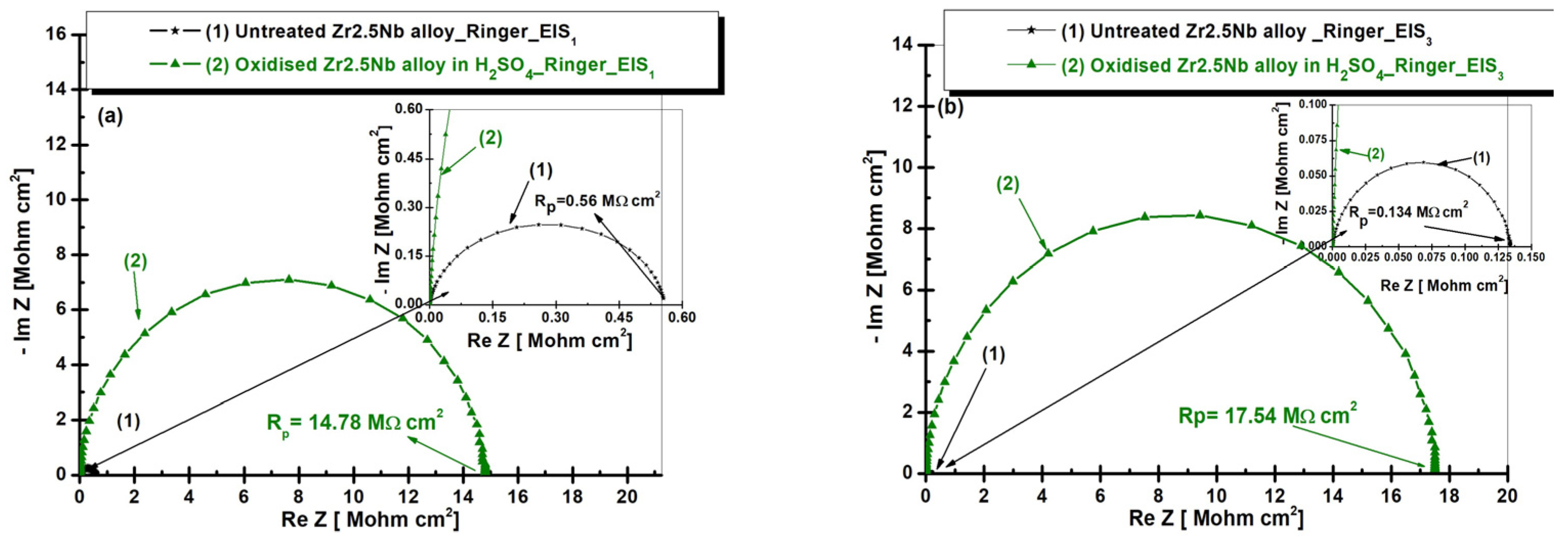 - Neaga, V.; Benea, L.; Axente, E.R. Corrosion Assessment of Zr2.5Nb Alloy in Ringer’s Solution by Electrochemical Methods. Appl. Sci. 2022, 12, 7976. [Google Scholar] [CrossRef]