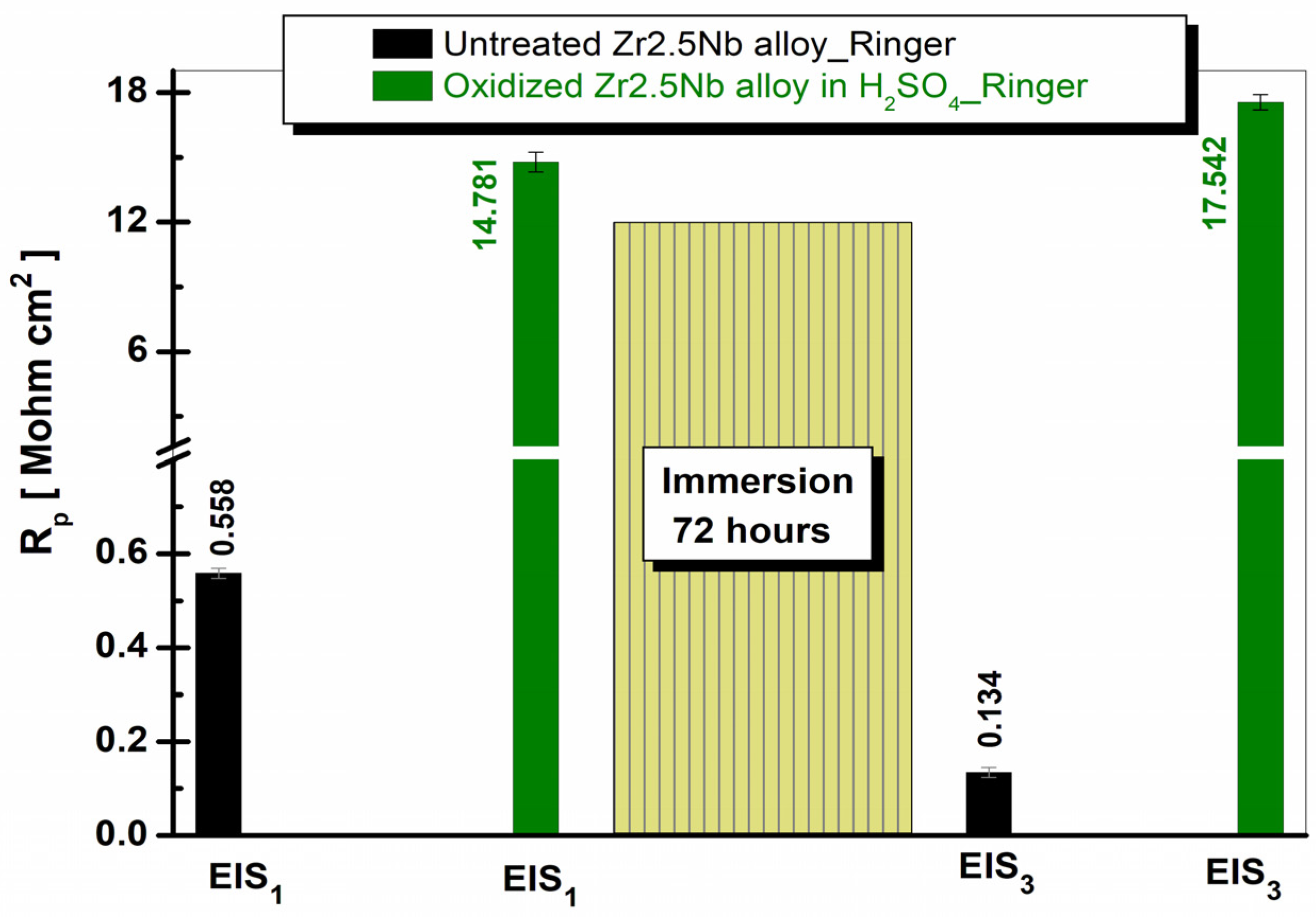 2.3. Corrosion Resistance Assessment of Untreated and Electrochemically Modified Zr2.5Nb Alloy in Both Physiological and Pathological Artificial Solutions