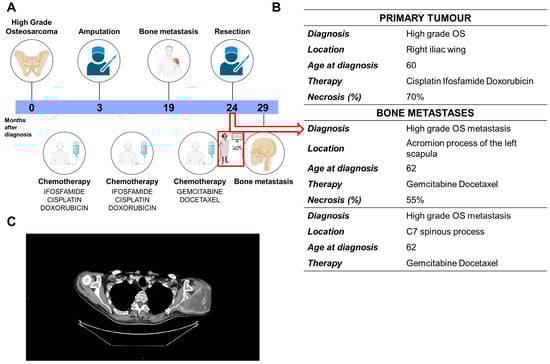 A 60-year-old man was diagnosed with a pelvic OS in 2022 (Figure 1A). He underwent neoadjuvant chemotherapy with DX, CDDP, and IFO (MTX was omitted because of age) (Figure 1B). The histological analysis of the primary tumor highlighted poor response (70% necrosis) and tumoral emboli inside blood vessels. The patient completed adjuvant chemotherapy 11 months after the initial diagnosis, using the same drugs. Eight months later, the patient reported pain in the left shoulder (Figure 1A,B). Chest and abdomen contrast-enhanced computed tomography (CECT) scans were negative for lung metastasis but showed a metachronous lytic bone metastasis (Figure 1C). A second-line chemotherapy was then started including GEM and DOC. After two cycles, the lesion was stable and the patient underwent surgery (24 months after first diagnosis). The histological analysis revealed a higher grade with respect to the primary OS and an even poorer response to chemotherapy (55% of necrosis) (Figure 1B). Fresh patient-derived tumor tissue was processed at our laboratory and anonymized under the acronym OS-MET-092. Twenty-nine months after OS diagnosis, the chest and abdominal CECT scans were still negative, but a magnetic resonance revealed a fracture in the spinous corpus of the 7th cervical vertebra (Figure 1A,B). The lesion was a plausible implication of the spread of disease and was accompanied by osteolysis in other vertebrae, as well. At the time of writing this paper, 16 months after the resection of scapular bone metastasis and 40 months after the diagnosis of OS, the patient was in follow-up with a cervical lesion and a suspicion of local recurrence; he was receiving treatment with zoledronic acid.