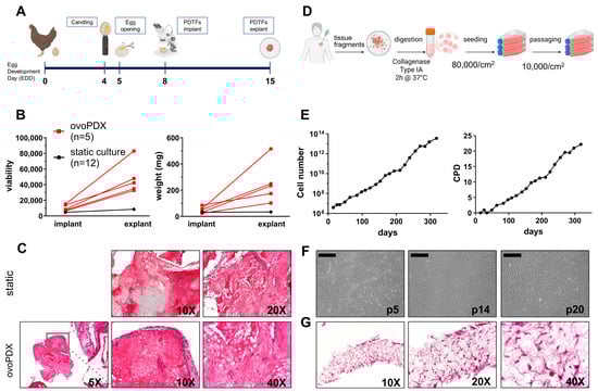 Establishment of OS-MET-092 models. (A): Schematical representation of the protocol for the establishment of ovoPDX; (B): comparison of viability (left) measured by PrestoBlue and weight (right) of OS-MET-092 PDTFs (i) cultured as ovoPDX and measured at implant (EDD8) and explant (EDD15). Each red point indicates a single fragment implanted; (ii) cultured under static conditions evaluated at the same time-points. The black points indicate the mean ± SEM of 12 fragments. (C): H/E staining of OS-MET-092 PDTFs cultured under static conditions in vitro or in ovo, as indicated. In each image, complete with objective magnification, it is possible to recognize atypic spindle epithelioid cells producing osteoid in a lace-like pattern; (D): schematic representation of OS-MET-092 tissue digestion and culture of OS-MET-R-092 cells; (E): growth curve of OS-MET-R-092 cells over time expressed as cell number (left) and CPD (right); (F): micrographs of OS-MET-R-092 cell morphology at passage p5, p14, and p20. All images 40X magnification (scale bar = 500 µm); (G): H/E staining of OS-MET-R-092 cells grown on a highly porous polystyrene scaffold showing atypical nuclei and prominent nucleoli, consistent with OS morphology. Objective magnification is indicated under each image.