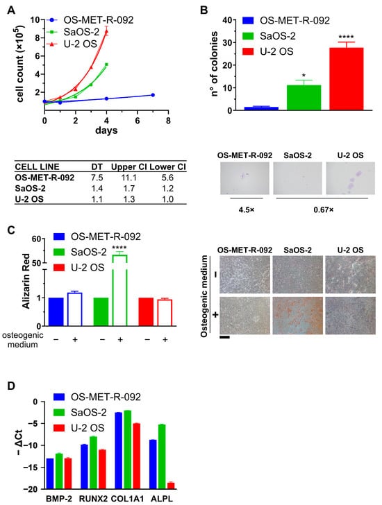 Characterization of OS-MET-R-092 cells. The phenotype of OS-MET-R-092 cells (blue) was compared to two reference established OS cell lines, SaOS-2 (green) and U-2 OS (red). Dots and bars represent the mean ± SEM. Statistical analysis: all comparisons versus OS-MET-R-092 * p < 0.05; **** p < 0.0001. (A): Proliferation assay: top: each symbol represents the cell count at the indicated time points, continuous lines indicate the interpolated exponential growth curves. Bottom: doubling time (DT) values and the relative 95% Confidence Intervals (CI) obtained from the interpolation of the exponential growth curve. (B): Clonal efficiency: top: each bar represents the number of colonies formed upon seeding of 100 cells. Bottom: micrographs of representative fields (4.5× or 0.67×). (C): Osteogenic differentiation: left: Each bar represents the relative quantification of total calcium deposited in control (−; solid) or osteogenic medium (+; empty). Right: representative fields of Alizarin Red staining. Scale bar = 500 µm. (D): Expression of osteogenesis-related genes by qRT-PCR. Bars represent the opposite of the ΔCt (Ctgene − CtACT), and β-actin was employed for normalization purposes.