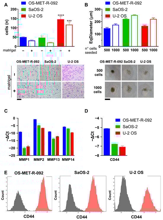 The migratory and invasive abilities of OS-MET-R-092 cells were also investigated (Figure 4A and Supplementary Figure S4A). All the three cell lines were able to cross the transwell membrane and, as expected, they exhibited a reduced migration in the presence of Matrigel. OS-MET-R-092 cells displayed a migratory and invasive behavior similar to that of SaOS-2, and inferior to U-2 OS cells, which are known for their higher motility and invasiveness (Figure 4A) [29]. Analogously, in wound healing assays, U-2 OS cells required less than 24 h to close the scratched area of a confluent monolayer, and exhibited markedly higher motility than SaOS-2 and OS-MET-R-092 cells, which needed more than 40 h (Supplementary Figure S4A). Of note, the ratio between the number of migrating (without Matrigel; −) and invading (with Matrigel; +) cells was significantly lower for OS-MET-R-092 cells compared to SaOS-2. We also evaluated the ability of OS-MET-R-092 cells to grow under 3D non-adherent conditions. Both OS-MET-R-092 and the reference cell lines demonstrated the ability to form spheroids (Figure 4B). Notably, OS-MET-R-092 generated compact and morphologically homogeneous spheroids (shape factor: 0.920; roughness: 1.093; Supplementary Figure S4B), which exhibited a decrease in diameter over time (Supplementary Figure S4B) and rapidly developed a darker core. In contrast, spheroids obtained from SaOS-2 and U-2 OS appeared bigger in size, but displayed irregular and less cohesive structures, characterized by progressive disaggregation and peripheral fragmentation. The observed morphological difference was quantitatively corroborated by lower shape factor values and higher surface roughness, which may reflect variations in the composition of the ECM (Supplementary Figure S4B). Both the invasive potential and the morphology of the spheroids can be attributed to a matrix-remodeling phenotype, which OS-MET-R-092 cells likely acquired due to their origin from metastatic tissue. Hence, we evaluated the expression of migration-related genes such as MMPs [16], as well as CD44, a cell surface receptor which binds several ECM proteins and is involved in the metastatic process [17,18]. MMP1, MMP2, MMP13, and MMP14 were all up-regulated in OS-MET-R-092 cells in respect to both U-2 OS and SaOS-2 cells (Figure 4C). Analogously,, CD44 was up-regulated in OS-MET-R-092 cells, as confirmed by both gene expression analysis and flow cytometry (Figure 4D,E), highlighting its potential role in the migratory and invasive behavior of these cells.