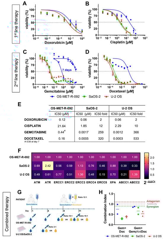 OS-MET-R-092 cells display a chemo-resistant phenotype. Non-linear transformation of dose–response curves of OS-MET-R-092 (blue), U-2 OS (red), and SaOS-2 (green) in response to DX (A), CDDP (B), GEM (C), and DOC (D) fitted using GraphPad Prism. Each curve represents the mean of at least three independent biological replicates. The table (E) reports the IC50 values for the three cell lines and the fold change in IC50 between OS-MET-R-092 and SaOS-2 or U-2 OS. (F) Expression of genes involved in chemo-resistance. The heatmap plot shows the comparison of gene expression between OS-MET-R-092 and the SaOS-2 and U-2 OS cell lines for the selected genes. The plot was generated using the 2−ΔΔCt values, with OS-MET-R-092 serving as the reference sample. β-actin was employed for normalization purposes. (G) Schematic representation of combined treatment in the patient and in vitro. (H) Combination index (CI) for the associations of GEM>DOC and GEM>GEMplusDOC for OS-MET-R-092 (blue), U-2 OS (red), and SaOS-2 (green). CI calculated according to the equation of Chou–Talalay: synergistic CI ≤ 0.90, antagonistic CI ≥ 1.10 and additive 0.90 < CI < 1.10. Each symbol represents a biological replicate and the line represents the mean.