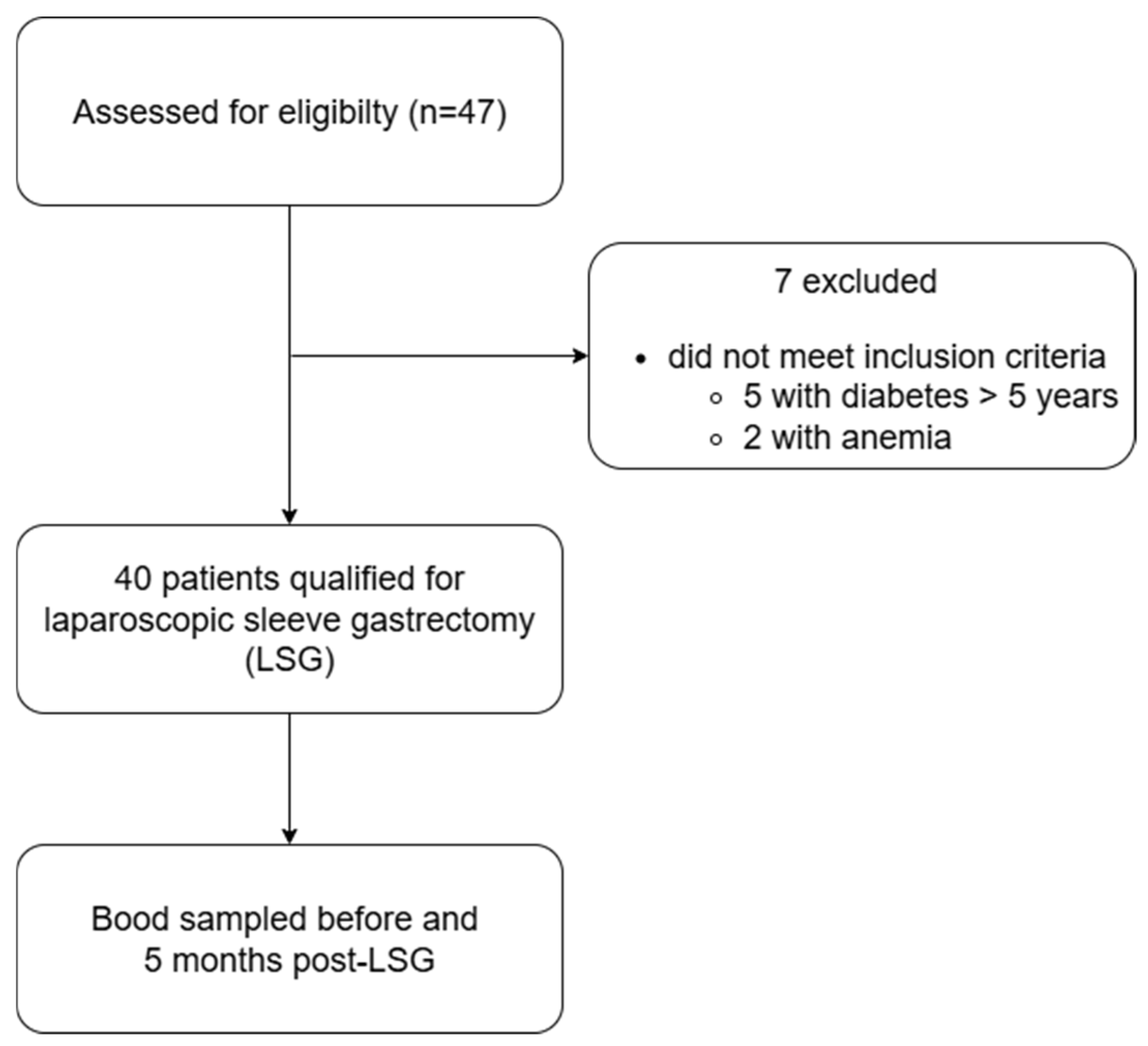 - Kalinowski, P.; Paluszkiewicz, R.; Wróblewski, T.; Remiszewski, P.; Grodzicki, M.; Bartoszewicz, Z.; Krawczyk, M. Ghrelin, leptin, and glycemic control after sleeve gastrectomy versus Roux-en-Y gastric bypass-results of a randomized clinical trial. Surg. Obes. Relat. Dis. 2017, 13, 181–188. [Google Scholar] [CrossRef]