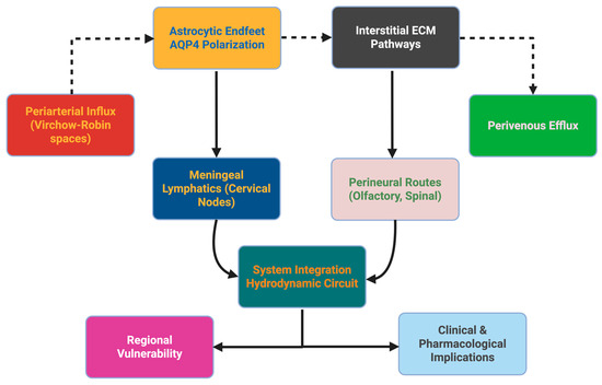 The goal of integrating arterial driving, parenchymal coupling, venous regulation, and lymphatic drainage into a single cohesive framework is to promote the notion of brain clearance as a true functional physiological system. Previous reviews have typically focused on one of these elements well, whether it is glymphatic inflow, venous compliance, or meningeal lymphatics; however, the relationship between these elements has remained poorly defined. This synthesis represents a modest step toward integrating these mechanisms into a single dynamic concept, which could be described as a glymphatic–venous axis, in which each element functions cooperatively and interactively with the others.