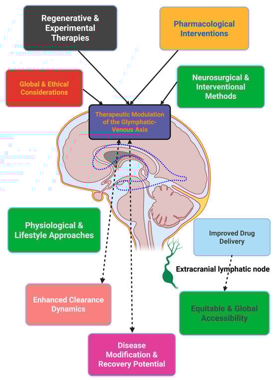 Many of the experimental manipulations may be capable of modulating clearance. These include methods for restoration of astroglial polarity (e.g., GLP-1 receptor agonists), promotion of oscillatory drivers (sleep protection, gamma entrainment, respiratory synchrony), enhancement of lymphatic function (PGF2α, VEGF-C), and alleviation of venous congestion (stenting, optimized ventilation strategies). These methods are presumed to be mechanistically distinct, indicating that possible combinations of methods may be feasible. The majority of evidence remains in the preclinical proof stage; strategies will require judicious translation to humans. Regulators of the glymphatic–venous axis comprise the molecular, rhythmic, immune, lymphatic, and venous dimensions [9,62]. They seem to work in concert, with sensitivity to sleep, circadian rhythms, pharmacology, systemic physiology, and pathology. While recent work has provided unprecedented mechanistic depth, much is still uncertain, especially for human physiology, regional specificity, and translatability. A fuller characterization of these regulators may provide avenues for targeting clearance; however, the area is still in an embryonic stage [63].