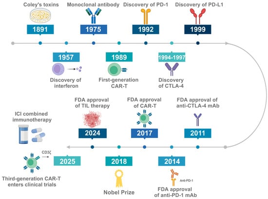 The early clinical immunotherapies for cancer include recombinant IFN-α and IL-2 [1,2,3]. While the initial clinical trials showed promise, advancements in cancer immunotherapy were hindered in the 200s primarily due to the unsuccessful outcomes of numerous vaccine trials. The first successful therapeutic cancer vaccine was approved for prostate cancer in 2010, with barriers to use. Shortly thereafter, a groundbreaking development was the approval in 2011 of ipilimumab, a monoclonal antibody targeting cytotoxic T lymphocyte antigen 4 (CTLA-4), for the treatment of advanced melanoma [4]. In recent years, innovative immunotherapies have emerged, such as checkpoint inhibitor monoclonal antibodies targeting programmed cell death 1 (PD-1) or its ligand, programmed death-ligand 1 (PD-L1) [5], alongside the pioneering chimeric antigen receptor T-cell (CAR-T) [6,7].