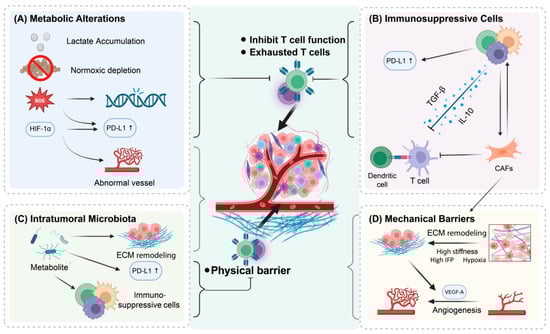 The tumor mechanical microenvironment has been recognized as an important emerging marker of cancer, characterized by increased ECM density, increased tissue stiffness, and increased solid stress [106]. Solid stress, fluid shear stress, and microstructural changes combine to impede immune cell infiltration [107,108,109]. Similarly, ECM also forms physical barriers by increasing stiffness, and its remodeling process can also promote the formation of immune escape microenvironments by transmitting physical signals such as mechanical forces and synergize with malignant features such as tumor microbiome, inflammatory state, and microvascular network, ultimately leading to immunotherapy resistance [106,110].