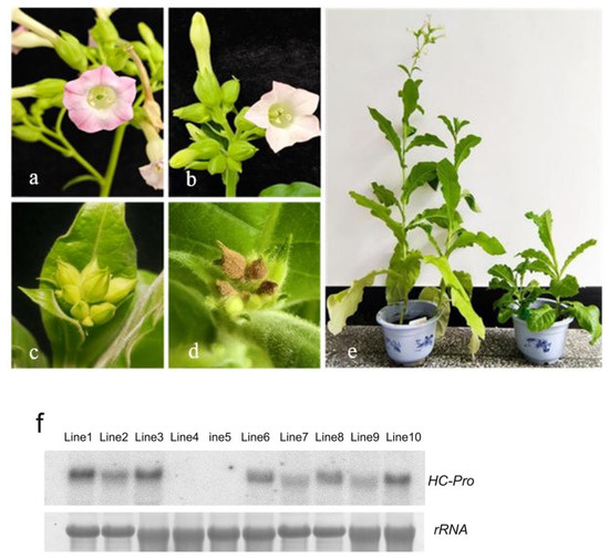 The leaves of 10 transgenic tobacco plants with significant viral symptoms were selected for further analyses. Total RNA was extracted to determine gene expression levels. The transgenic tobacco plants were identified by Northern blotting. Compared with those in the other transgenic plants, the expression levels of the HC-Pro gene in Line 1, 3, 8 and 10 transgenic plants were greater (Figure 1f). The results revealed that the expression of HC-Pro results in severe developmental defects in floral organs and an abortion phenotype.