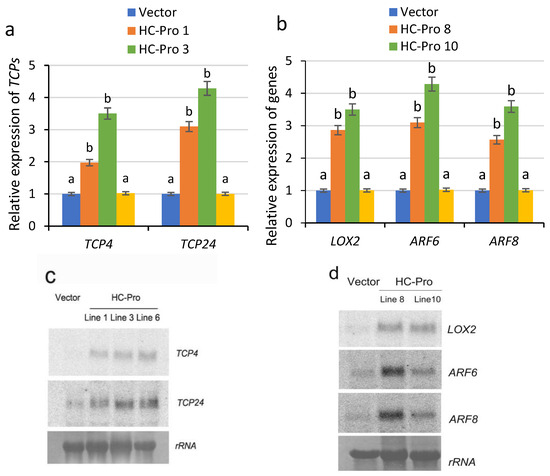 To further explore the molecular mechanisms in transgenic tobacco plants expressing HC-Pro, the expression of the downstream genes LOX2, ARF6, and ARF8, which are regulated by TCP4, was analysed via RT–qPCR and Northern blotting. The results revealed that LOX2, ARF6 and ARF8 were significantly upregulated in the transgenic lines HC-Pro 8 and HC-Pro 10 (Figure 2b,d), confirming that the abnormal expression of these genes was the direct cause of various abortion phenotypes in transgenic plants.