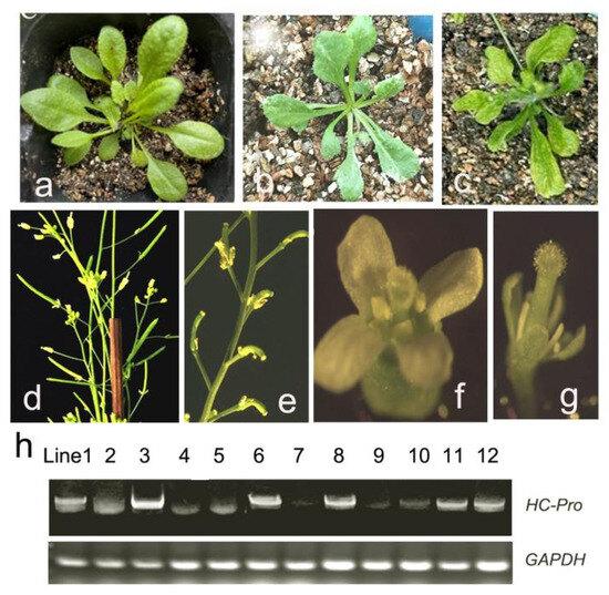 Observations of the phenotypes and identification of HC-Pro transgenic A. thaliana. (a) Control plants transformed with the empty vector. (b,c) Aberrant phenotype of the HC-Pro transgenic A. thaliana. (d) Fruit pods of plants transformed with the empty vector used as controls. (e) Shorter fruit pods in HC-Pro transgenic plants. (f) Floral organs of plants transformed with the empty vector used as controls. (g) Defects in floral organ development in the HC-Pro transgenic plants. (h) RT-sqPCR analysis of the expression levels of the HC-Pro gene in HC-Pro transgenic plants, with GAPDH used as a reference gene.